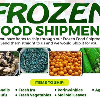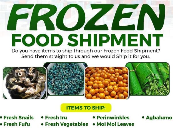 We daily organise shipping for all types of frozen foods such as fresh snails, fresh fufu, fresh Iru, fresh vegetables, periwinkles, moi moi leaves, agbalumo and dry food shipment like beans, palm oil and any other exportable Nigerian food products to countries like USA, UK, Ireland, Canada and other European countries.